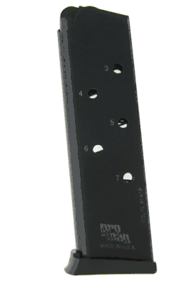 ProMag Colt 1911 replacement magazine blued steel. This is a 7 round 45 acp magazine made in the USA by ProMag. Made from heat treated steel. Uses a follower, lock-plate, and base-plate molded from a proprietary DuPont Zytel based black polymer. Uses ProMag load um up and stack um up for years anti-fatigue springs. FREE shipping on orders over $75! Orders shipped within 24 hours except week-ends and holidays. Gunclip Depot has the largest selection of Colt 1911 Magazines. If you do not see the gun magazine you are looking for send us an email and we will try to locate it for you. We recommend using a magazine loader with this magazine. Select the loader shown below.